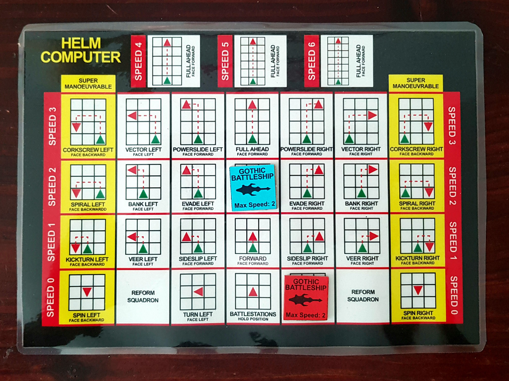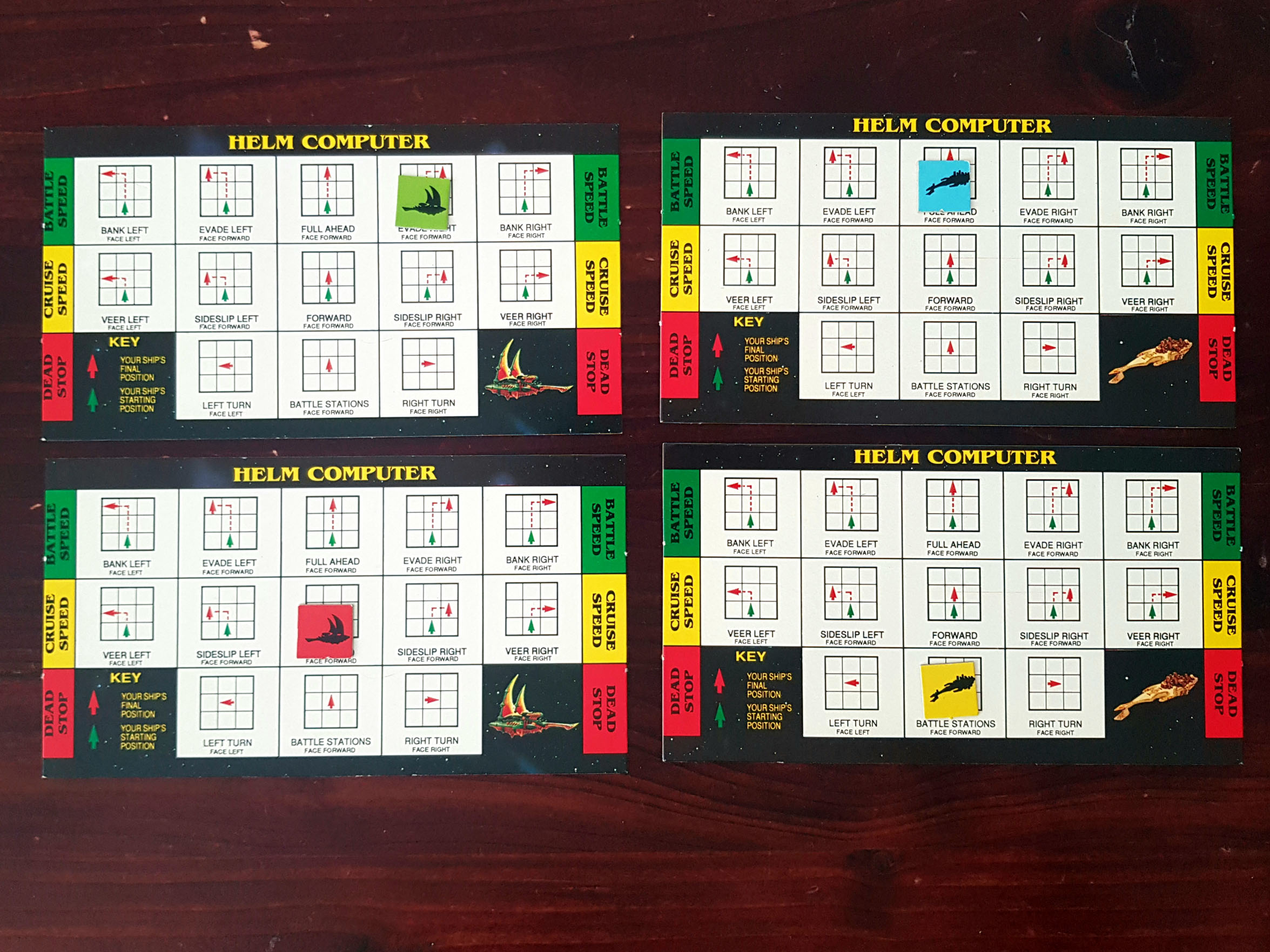 The Helm Computer is a piece of cardboard with all possible movements printed on it. In the movement phase, both players secretly place a token representing each