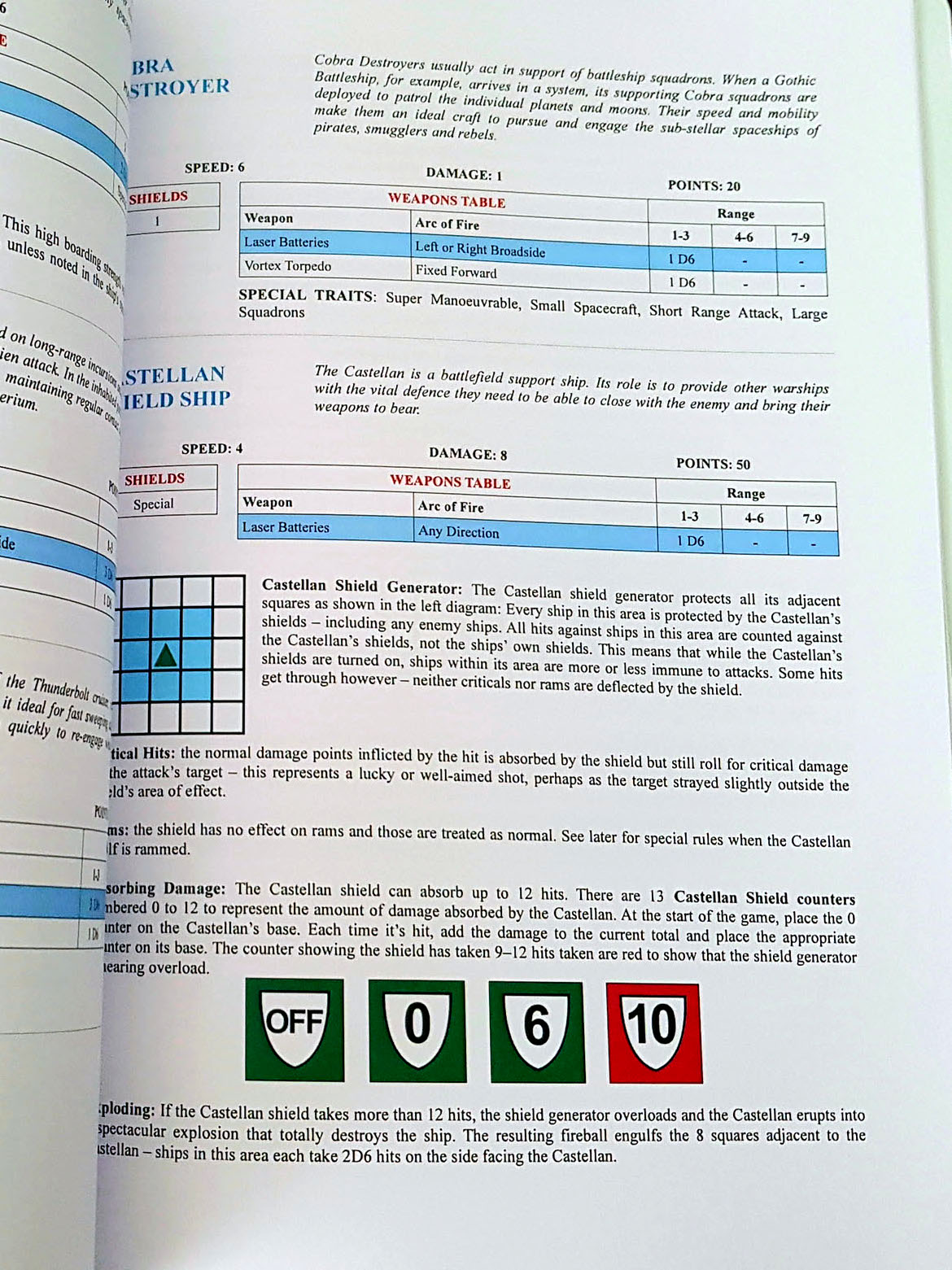 table and a schematic drawing showing how many shield points are on each side. Lastly, there is a weapons table. This is all you need to deploy your spaceship into